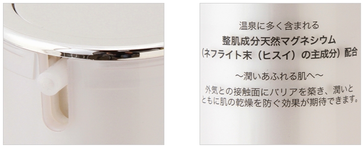 女性の永遠の課題である「美」。しかし、年齢やストレス・紫外線等さまざまな理由により「美」を崩すシワが発生し、心の痛みにつながっています。 そんな要望に応えられる化粧品を提供したく商品の企画を立ち上げました。 日本初となるネフライトを配合し、保温・保湿成分を高めます。 |